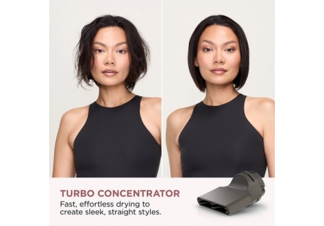 The four included attachments allow users to tailor their styling routine. The Turbo Concentrator provides focused airflow for sleek looks, the QuickSmooth Brush helps smooth and shape hair, the DefrizzFast Diffuser enhances curls and reduces frizz, and the FrizzFighter Finishing Tool supports polished, glossy results.