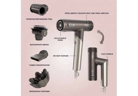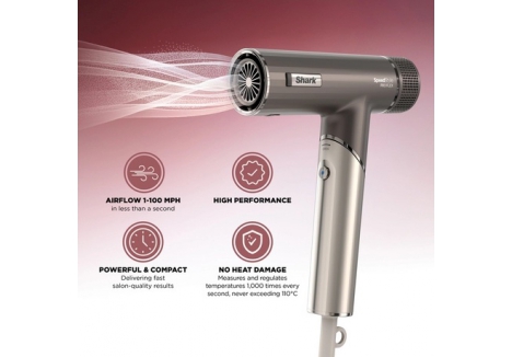 The Shark HD542UK SpeedStyle Pro FLEX hair dryer in Mocha Silver is designed for users seeking fast drying, versatile styling and enhanced hair protection. With a lightweight build, high-velocity airflow and a compact folding handle, this 4-in-1 system delivers salon-quality results while remaining easy to store and ideal for travel.