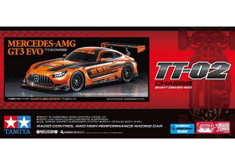 Tamiya welcomes another racing car – this time, the Mercedes-AMG GT3 EVO – paired with our popular TT02 chassis. The Mercedes-AMG GT3 EVO was developed for GT3 races in 2020. Using the previous model as a base, a 6.3-litre V8 engine capable of 550hp is employed and aerodynamics are improved across the board. It has an automatic data logging system for racing analysis, and the engine automatically starts once the car is drop started from its air jacks. Also providing top level safety, this car has been used by racing teams around the world.