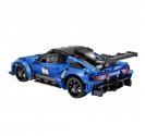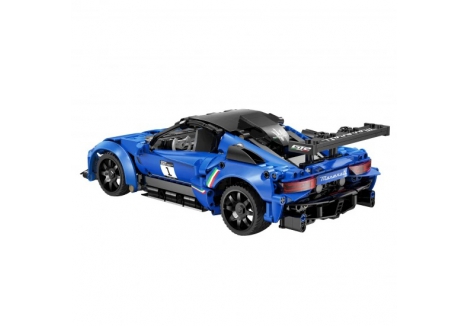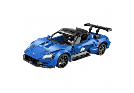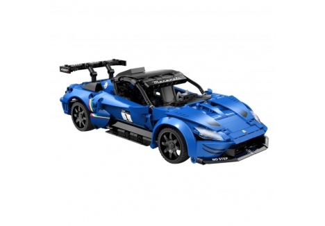 A detailed self-build brick model of the Maserati GT2 racing car with blue and black colour scheme. This model features printed pieces (without stickers) and manual driving, making it ideal for play and display alike.