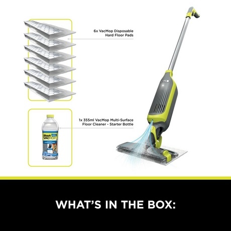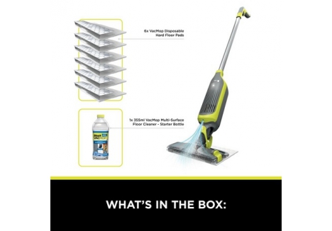 - Accessories: VacMop device, charger, six disposable pads, and 350 ml multi-surface cleaning solution; a complete starter kit for immediate use.