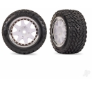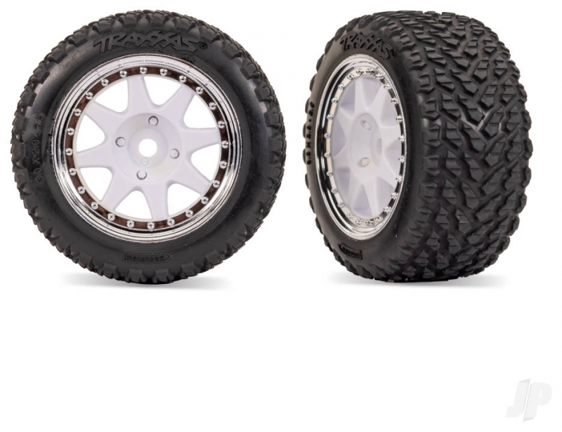 Mini Rally front tires are harder than rear tires to maintain Rally's superior handling and balance. Mini Rally tires offer excellent traction on pavement, dirt, gravel, and more with a unique directional tread pattern. Tires come pre-glued and mounted to white 8-spoke Rally wheels with chrome beadlock trim. Sold as a pair. Fits 12 mm hex, front position.