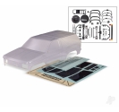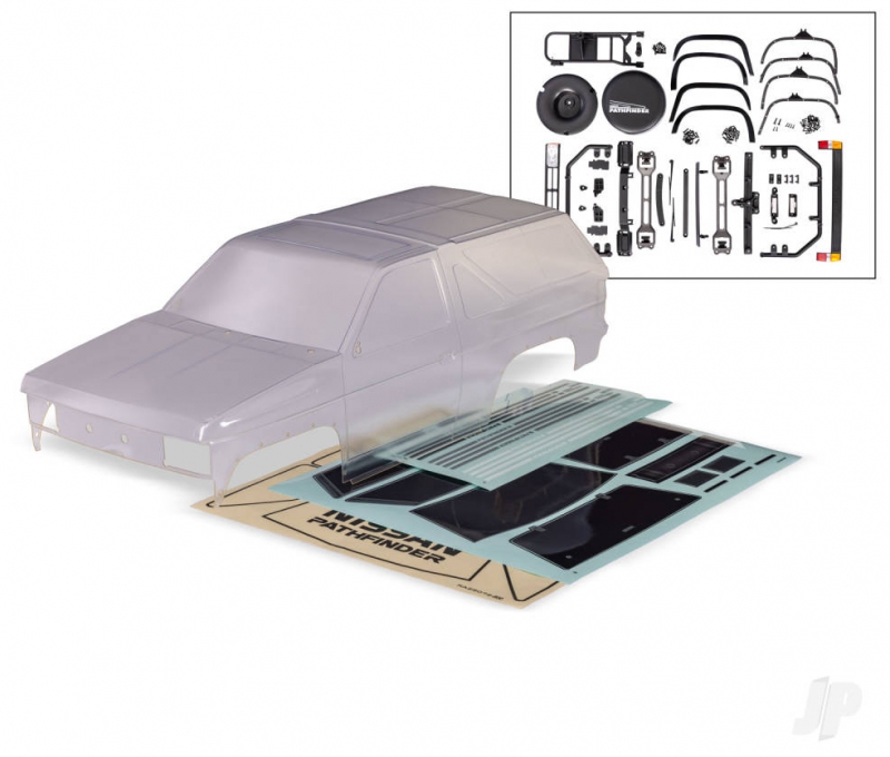 The clear TRX-4 Nissan Pathfinder body comes fully trimmed and ready to paint with decal sheets, window masking, molded body accessories with hardware, and pre-applied overspray film. Requires 8080X inner fenders and fits 312 mm wheelbase.
