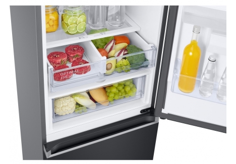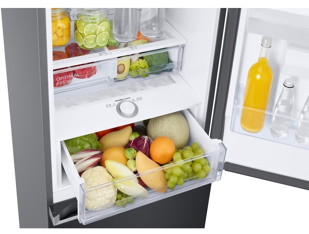 Samsung Series 6 SpaceMax frost free fridge freezer includes an Optimal Fresh plus box that allows storage of fish, meat, fruit, and vegetables in one place, supporting simpler organisation when planning meals. Humidity Fresh plus drawer functionality supports choosing a more suitable temperature and humidity for fruit and veg, helping delicate produce stay in better condition for longer. These storage zones sit alongside the two salad crispers and adjustable shelves, helping chilled storage stay flexible when shopping habits change through the week.