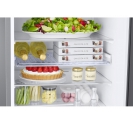 Internal organisation supports that capacity with four fridge shelves, adjustable shelf positioning for taller items, and two salad crispers for fresh produce. Dedicated storage features include an egg rack and bottled drink storage, helping smaller items and drinks stay organised. The fridge section uses LED interior lighting to brighten shelf space for easier visibility, while the freezer section uses three drawers with clear drawer fronts. Freezer interior light is listed as no, so clear fronts and organised drawer use help improve day to day visibility.