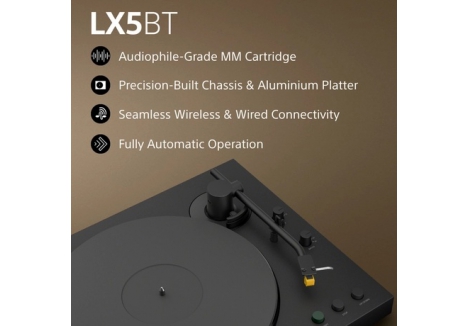 • Product Type: Sony PSLX5BT.CEK wireless Bluetooth turntable, Sony PSLX5BT.CEK fully automatic belt-drive turntable, Sony PSLX5BT.CEK Pure Black vinyl turntable, Sony PSLX5BT.CEK turntable with premium MM cartridge and stylus, Sony PSLX5BT.CEK turntable with adjustable gain switch and gold-plated output