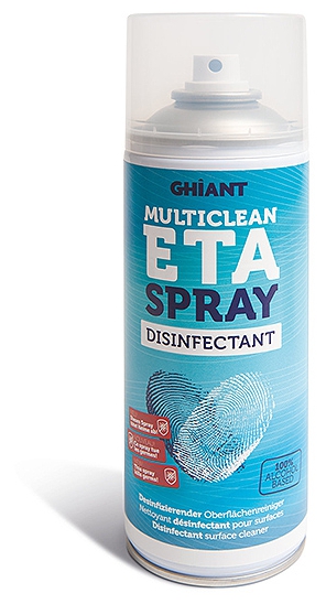 Ghiant Multiclean ETA Spray can be used for disinfecting and cleaning eg: keyboards, mobile phones, worktops, car interiors, tables, chairs, handles, handrails, electrical devices, fitness equipment etc.