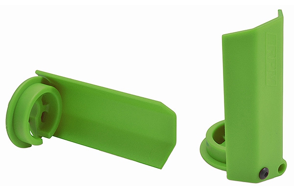 RPM Shock Shaft Guards are a simple design, replacing stock shock spring cups with ones that have mounting holes for a thin but tough shield that rises up to the base of the shock body. The guard completely blocks debris from striking the shock shaft. The back and sides are open, which prevents debris from building inside the guard as well.