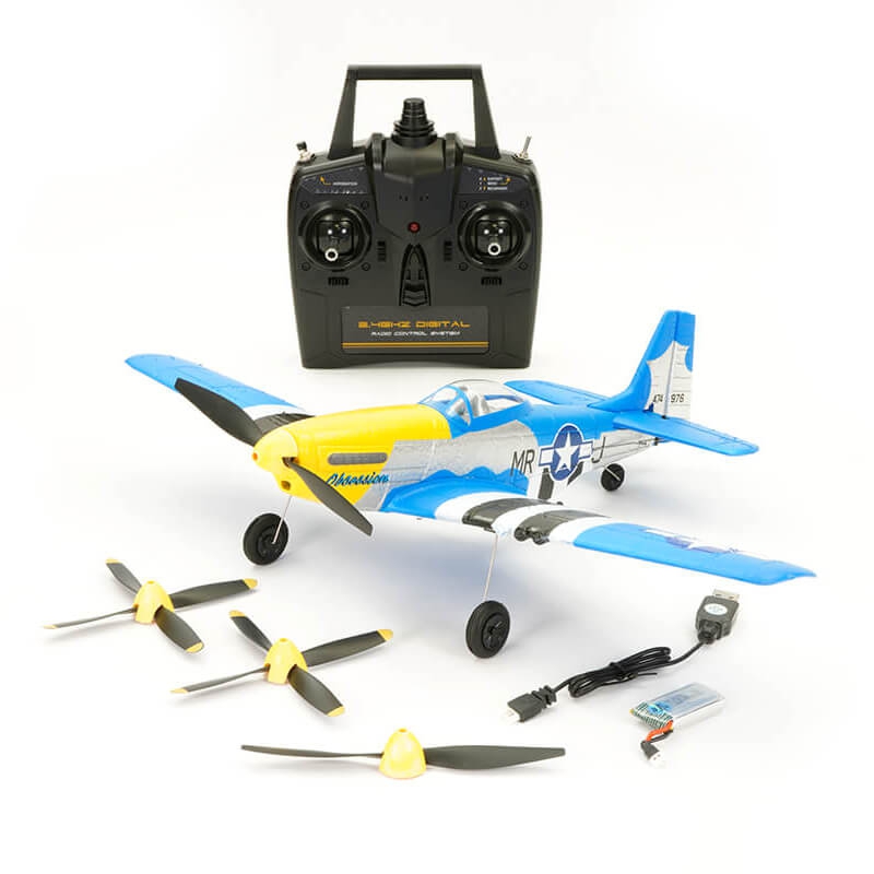 Volantex RC Mini Mustang P-51D 761-5 V2 blue is a small plane with excellent performance. Thanks to the integrated Xpilot gyroscope stabilizer system with a powerful engine, the plane is stable, agile and can perform acrobatics. It is equipped with an aerobatic function, just press one button and pull the stick to easily control Mustang P-51D and perform aerobatics. 3-level flight control assistant (full assisted beginner/partial assisted intermediate/manual control expert) helps beginners learn to fly step by step. Range of control apparatus around 200m, flying time on 1 charge up to 15 minutes.