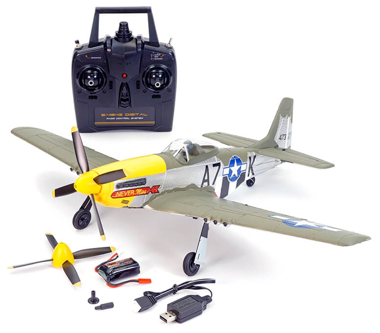Finished in a striking scale livery of matt green, silver fuselage with invasion stripes, yellow cowl and spinner this P-51D looks the part straight from the box. Additional details such as a 4-bladed propeller, landing gear with doors, clear canopy with pilot and cockpit elevate the model to semi-scale status. What’s it like to fly? Well, this larger model from Volantex is powered by a high-performance brushless motor and 2S 7.4V 400mAH battery pack for extended flight times. Fast and maneuverable and capable of vertical flight, it’s easy to fly thanks to its X-Pilot stabilisation system where you can select 3-modes of flight performance - Full Assist, Soft Assist or No Assist. One key aerobatic function lets you roll and flip like a pro.