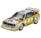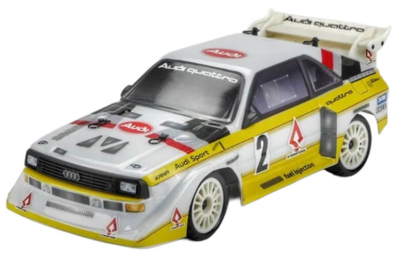 The body is beautifully reproduced in a lightweight, hobby-grade vacuum-formed shell with crisp detailing and high-quality decals. The paint scheme pays homage to the iconic Audi Quattro factory rally colours that defined Group B competition.