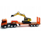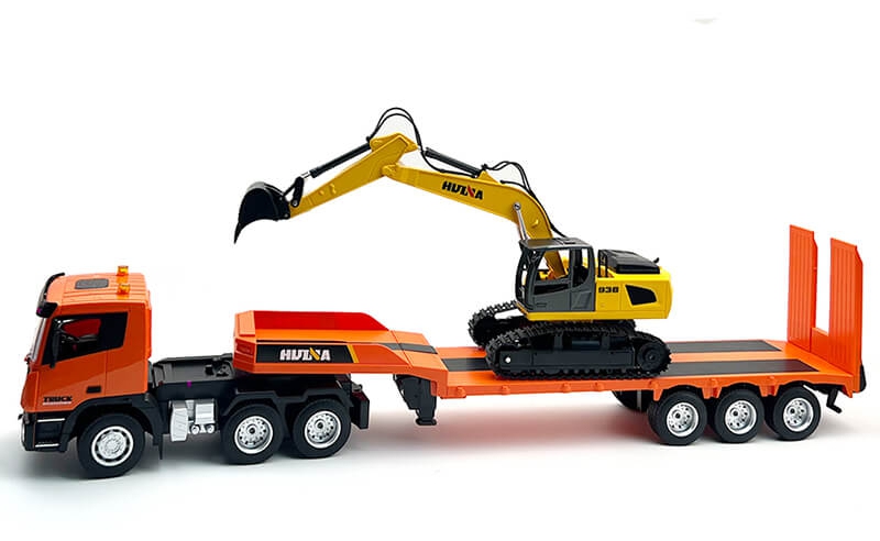 Simulate transporting loads or machinery with this 9ch 1:24 scale truck and flat bed trailer from Huina. With the flat bed mounted separately to the main cab, 270° cab rotation can be achieved for manoeuvring in tight spaces. The tailgate can be raised and lowered for easy loading. A one press button from the transmitter provides simulated sounds and LED lights on the cab. When unhitched, the flat bed is supported by adjustable front legs, leaving you free to drop your load and return later.