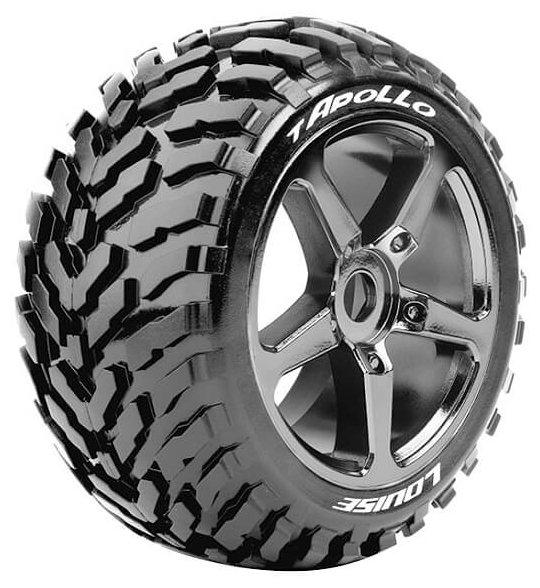 Series: T-ApolloCompound: SoftColour: Black ChromeHex Fitment: 17mmFits: 1/8 Off-Road TruggyTyre Width: 64mmTyre Diameter: 145mmWheel Offset: 0Includes Insert: YesGlued: Yes