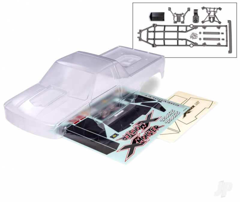 The heavy duty X-Monster Chevrolet GMT400 CK body is made from thick 2 mm polycarbonate for increased durability. The clear body comes fully trimmed and ready to paint with decal sheets, window masking, and pre-applied overspray film. Includes inner cage, clipless body latches, body reinforcements, and mounting hardware.
