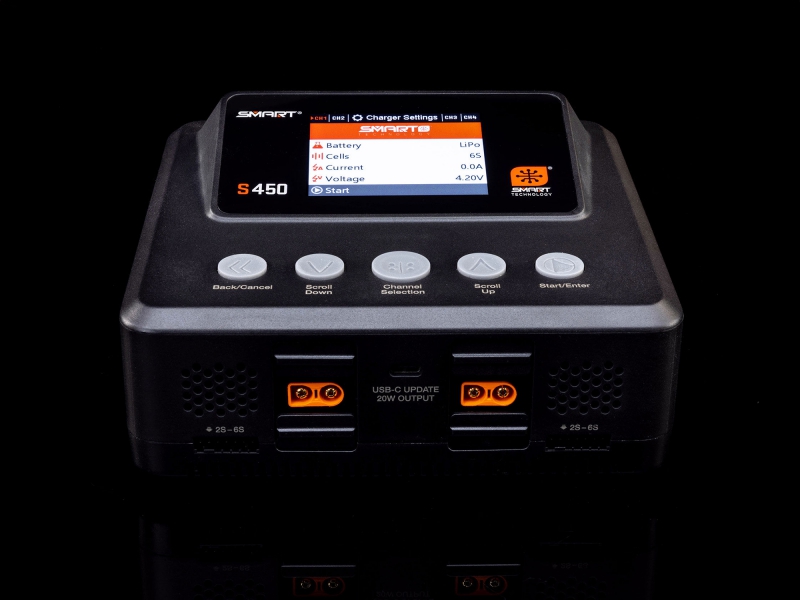 The S450 Smart G2 AC Charger's updated interface features fresh, intuitive menus, icons, and navigation tools. Its clear, easily understandable indicators of Smart battery history and performance provide the information you need to make the best decisions about your batteries when putting gear together for a day at the field or track. USB-C input and output ports enable you to charge secondary devices and to update the charger's firmware, so you always have the latest version.